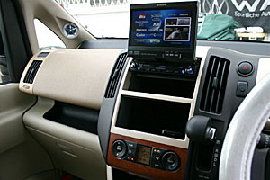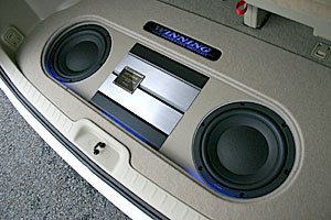 Fミッドスピーカーはドア純正位置へ、ツイーターはフロントピラーにうめ込み処理、ハンドル右側の小物入れは加工してETCをインストールしています。 Rスピーカーはサテライトタイプ、ラゲッジスペースにはサブウーハー、アンプをインストール、夜にはネオンが奇麗です。