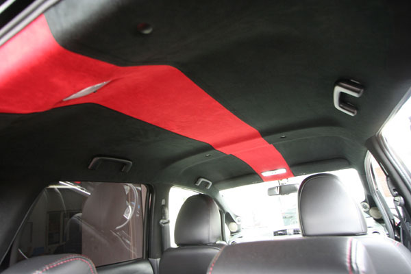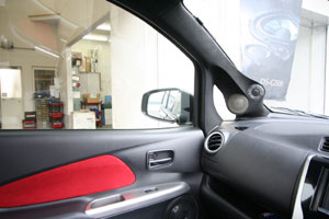 デザインに合わせて天井を張替え!、フロントピラーにはツイーターとミッドレンジスピーカーをインストール。