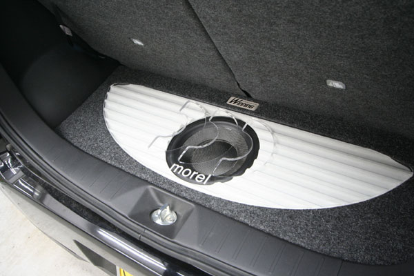 ラゲッジスペースにサブウーハーをインストール、ボードでカバーして荷物も安心してのせられます。