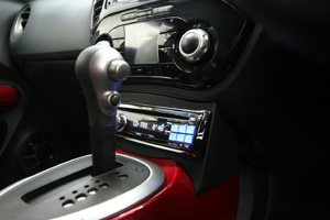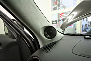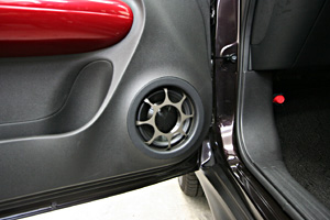 ラゲッジスペースにアンプ、プロセッサーなどをインストール。荷物スペースにも配慮した取付です。 Fドアにミッドスピーカー、Fピラーにツイーターをそれぞれ埋込み。センターコンソールを延長させるデザインでデッキをインストールしています。