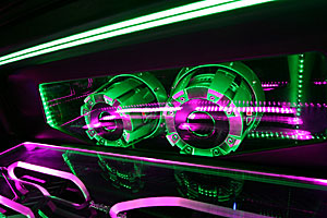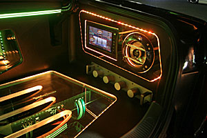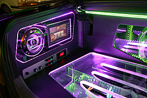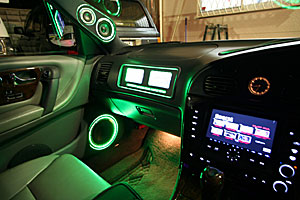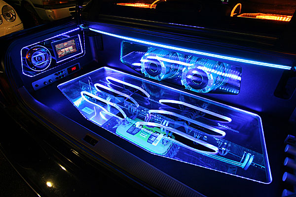 トランクスペース、ネオンライトやアクリルパネルを利用してのカスタムインストール。