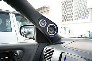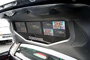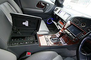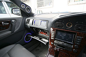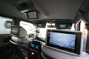 コンソールのパネル移設やグローブボックスへ機器を埋込んでいます。ヘッドレストモニター、バイザーモニターなどもインストール。