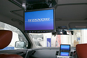 ダッシュボード上にワンオフ加工でモニターをインストール、後席用にフリップダウンモニターも取付け。