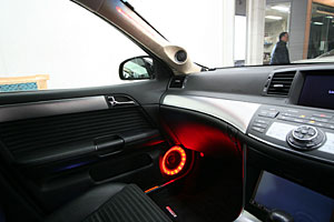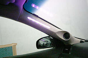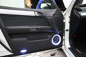Fピラーにツイーターを埋込み、LEDで演出しています。ミッドスピーカーはFドアにインストール、こちらもLEDを付けています。
