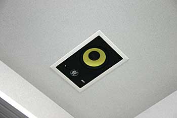 リヤスピーカーは天井にうめ込み処理、今回はフロント2ch+サラウンドスピーカーと言う4chのシステムです。(撮影用にスピーカーグリルを外しています)