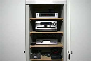 機材の収納スペース。一番上にある機材は音質&映像向上させるクリーン電源です、安定した100V電源を確保し、ノイズなどもクリアにします。