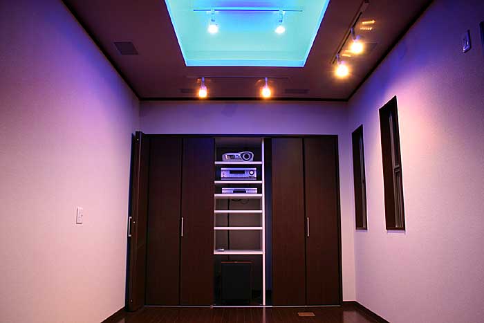 新築2F、照明にこだわった本格7.1chホームシアターをインストール。 スピーカー、スクリーンは天井うめ込みデザインしてインストールし、クローゼットにサブウーハーや機材を納めています。