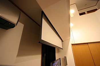 リビングルームにシアターリフォームにて100インチスクリーン、うめ込みリアスピーカー、AVアンプ、プレイヤーなどをインストール。