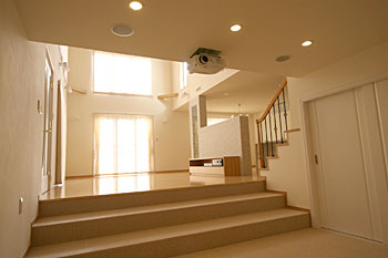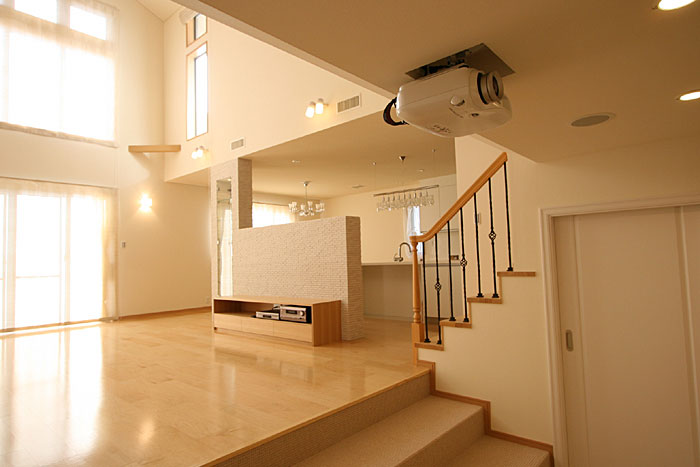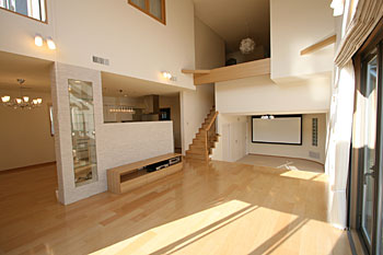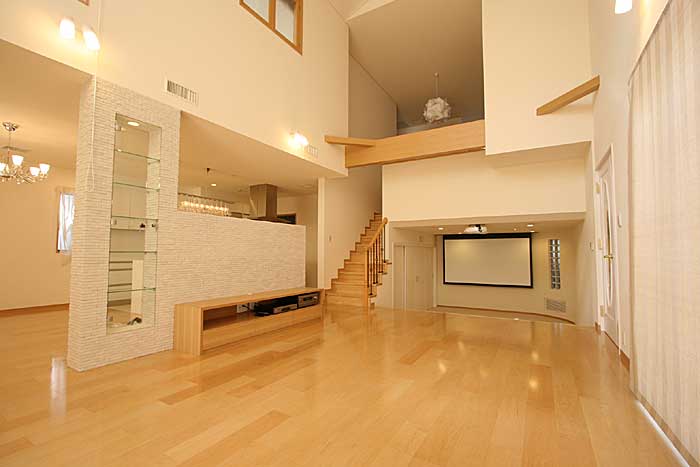 明るく開放的でとても気持ちのよいリビング空間に100インチスクリーン、サラウンドスピーカーシステムなどインストール(新築)