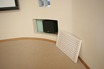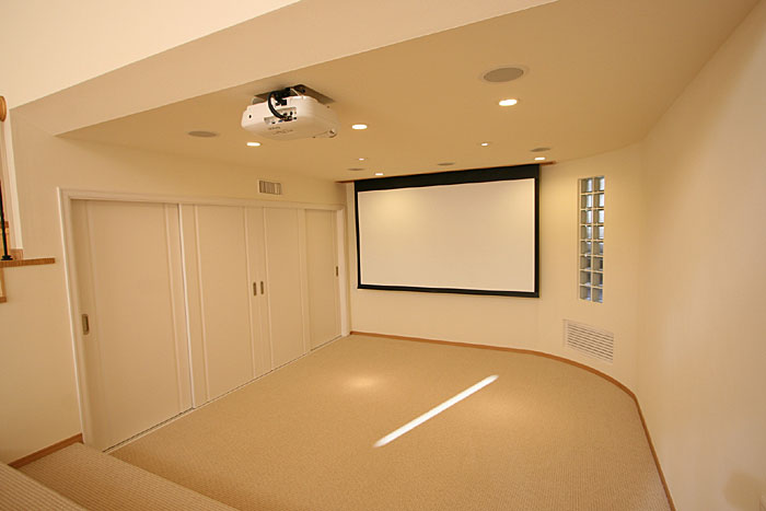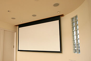スクリーンは天井ボックスに取付け、フロントスピーカーは天井にインストールし壁面のRデザインに合わせてラウンドさせてレイアウトしています。