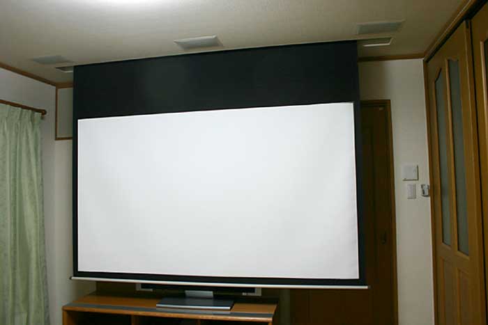 スクリーン(電動100インチ)とスピーカーを天井にうめ込み、サブウーファーは棚へ設置してカバーを製作。