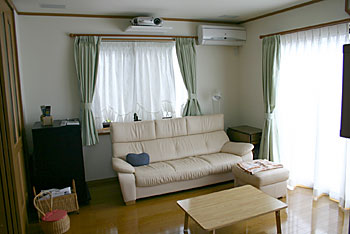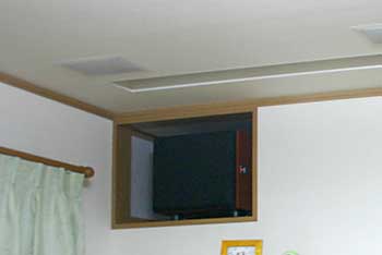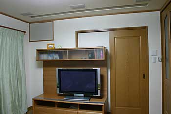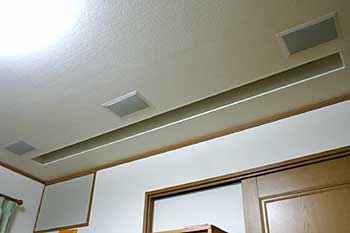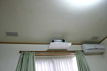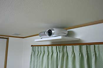 リヤスピーカーは天井へうめ込み、プロジェクターは棚に設置し生活スペースへの影響は有りません
