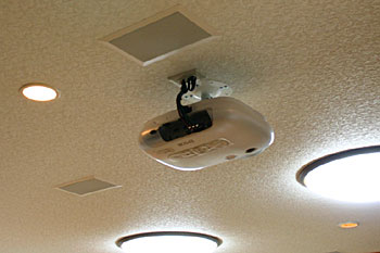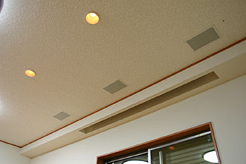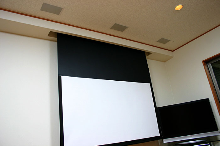 はじめの設計ではスクリーンも天井にうめ込む予定でした、しかしリビングルームの天井裏に大きな梁が通るために建設途中で設計を再度検討し、天井部分スクリーンボックスに変更しております。天井裏の梁はかなり立派物でしたのでスピーカー用の配管も行き場がなくなりましたが、天井からさげてスクリーンボックスを設計したので配管も全てそこを通っています。