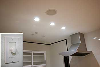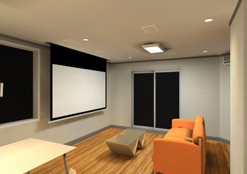 新築2Fの落ち着いた雰囲気のあるリビングダイニングに100インチスクリーン、プロジェクター、プラズマモニター、7.1chスピーカーシステムなどインストール。 プラズマを壁掛け、スクリーンとスピーカー、照明は天井にうめ込んでいます。