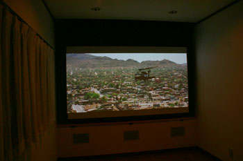 新築、シアタールームにインストール。オーナーのご希望でリビングの隣にある6畳の部屋をシアター専用ルームに設計、出来るだけ大きなスクリーンで機材を目立たなくしたいとのことでした。(スクリーンサイズ100インチ)