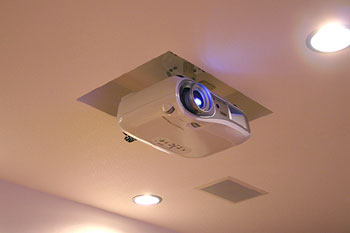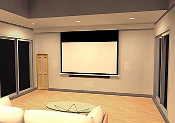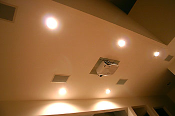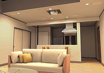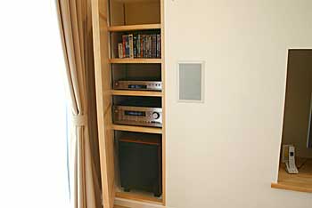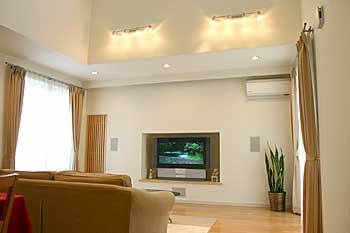 新築1階、吹き抜けのあるリビングルームに設置。「プロジェクター、7.1chスピーカー、AVアンプ、ユニバーサルプレーヤ、プロジェクションTV等のインストール」 ホームシアターファイル34号掲載