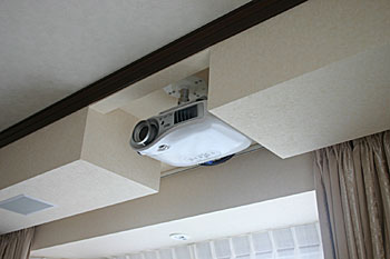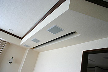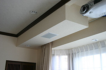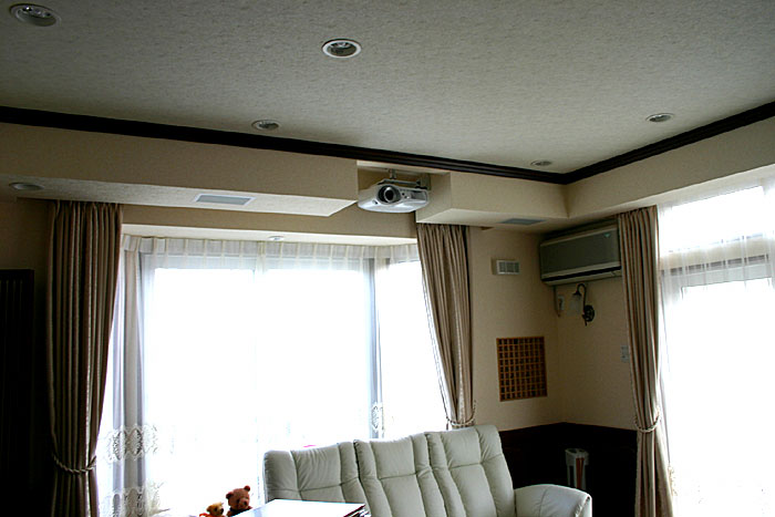 新築1Fのリビングルームに5.1chスピーカー、スクリーン、プロジェクター、マルチゾーンプレイヤーなどをインストール。