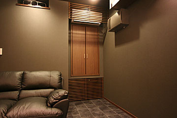 シアタールームは防音設計され窓もありません。部屋全体は黒く統一されて、埋込みスピーカー等もクロスに合わせて塗装しています。