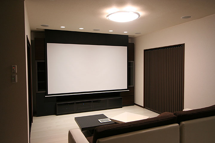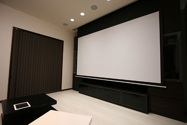 新築1F、リビングルームに120インチスクリーン、7.1chスピーカー、iPadコントロール等のホームシアタシステムをインストール。
