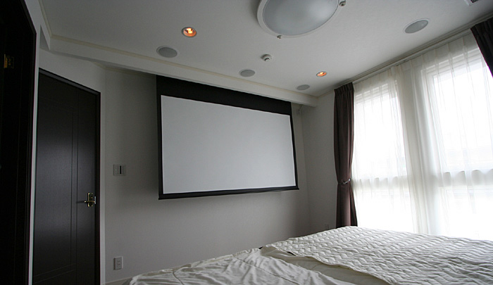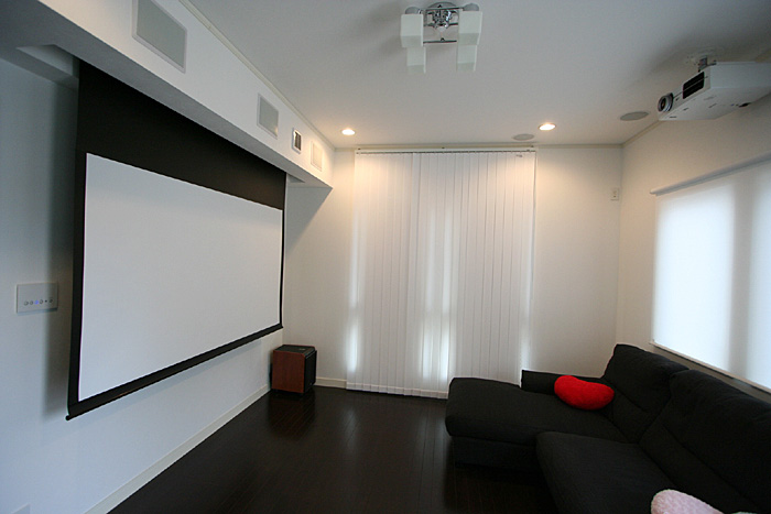 そしてこちらは2F寝室にもう1つシアターをインストール。スクリーン、プロジェクター、7.1chスピーカーシステムでこちらでも本格的に楽しめます!!