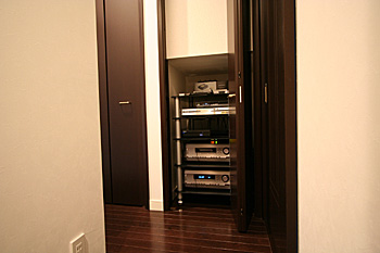 階段下にある収納スペース。リビング、キッチン、2F寝室には機材はおかずに全てこちらから各部屋に配信しています。 1F、2F両方で全て楽しめます。
