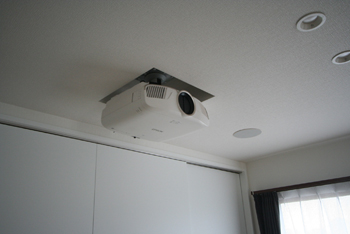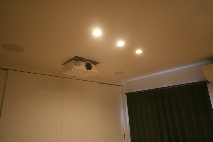 プロジェクターは天吊り設置、金具が目立たないように造作でへこましております。Rスピーカーは天井に埋込みでインストール!