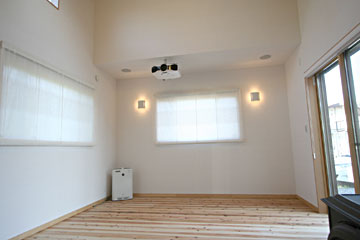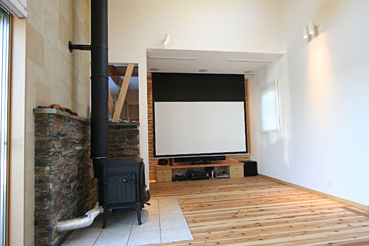 吹抜け、まきストーブが印象的なリビングに100インチスクリーン、5.1chスピーカー、プロシェクターなどのホームシアターシステムをインストール。