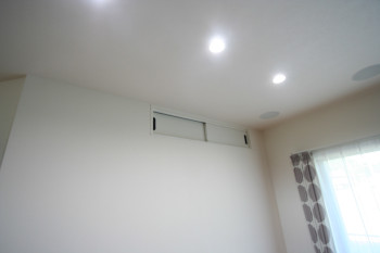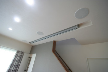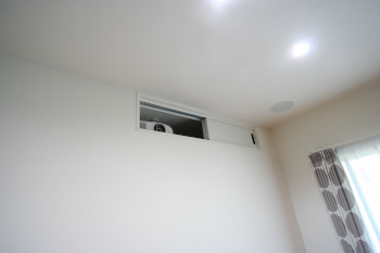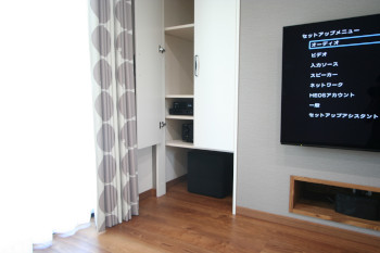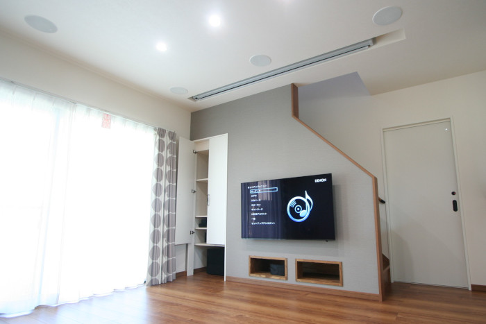 新築リビングルームに100インチスクリーンでホームシアターをインストール! リビング階段側の壁面を利用し、壁掛テレビ、機材収納を設けております。