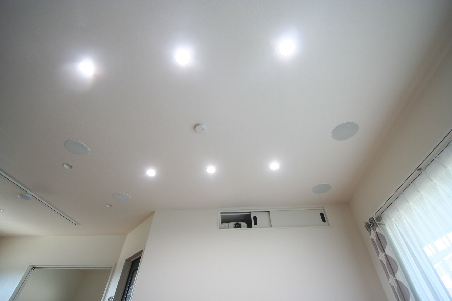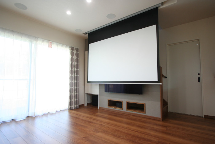 新築リビングルームにスクリーン、壁掛テレビを利用したホームシアターをインストール。