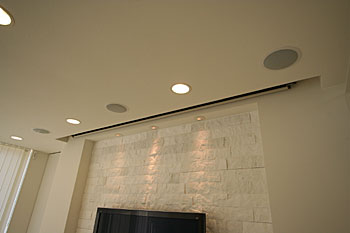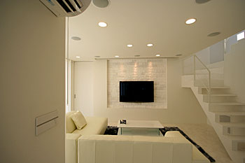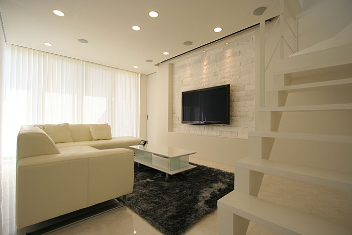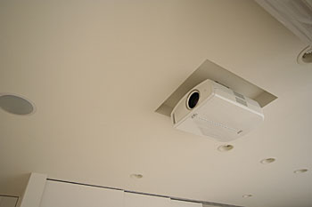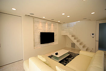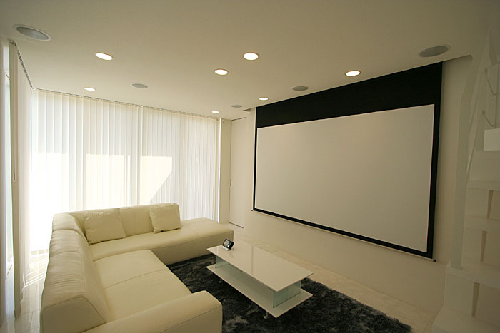 新築、白を基調に統一されたリビングにホームシアターを設置。120インチスクリーン、プロジェクター、埋込みスピーカー、3Dテレビ等をインストール ホームシアターファイル誌において、2012ホームシアターグランプリ金賞に選ばれました