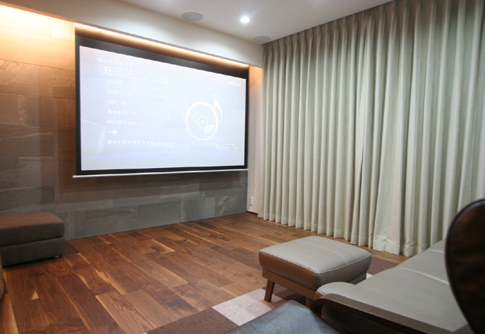 新築のビングルームにスクリーン、TV、埋込みスピーカーのホームシアターをインストール。