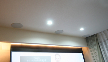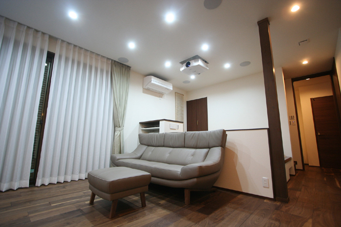 スピーカーは天井に埋込み、プロジェクターは天吊り設置、金具が目立たないように造作でへこましております。