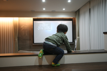 新築のビングルームにスクリーン、TV、埋込みスピーカーのホームシアターをインストール。リビングから繋がる畳スペースから楽しめる仕様です!