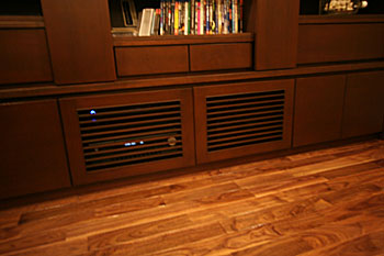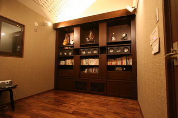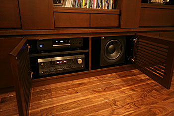 本棚をホームシアターを考慮してスクリーン、スピーカースペースを確保。スクリーンはサウンドスクリーンを選択。