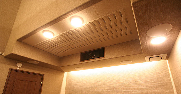 天井をデザインして、プロジェクター、Rスピーカー、照明をアレンジ。