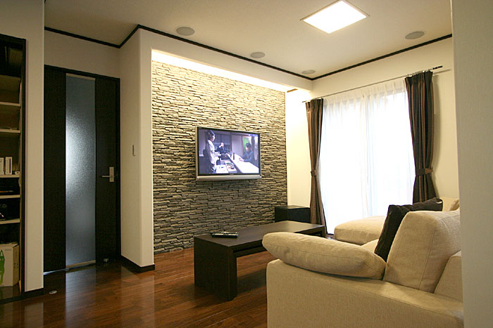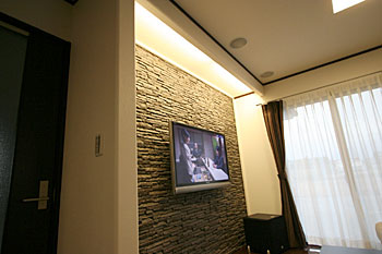 新築1Fリビングルームに壁掛TV、7.1chスピーカーシステム等ホームシアターをインストールです。