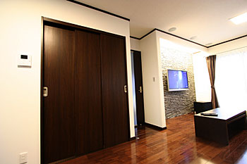 機材の収納には入り口を挟んだダイニング側の収納を利用、扉をしめてもリモコン操作が出来るようにシステムを組んでいます。