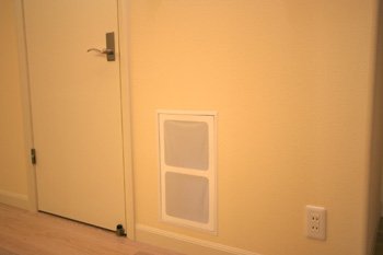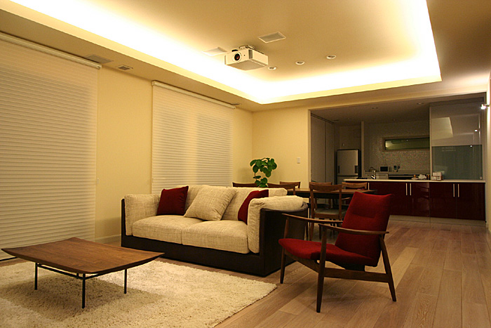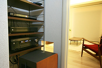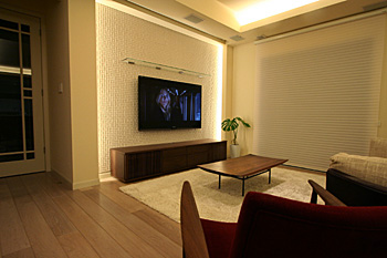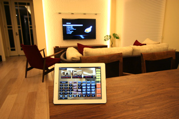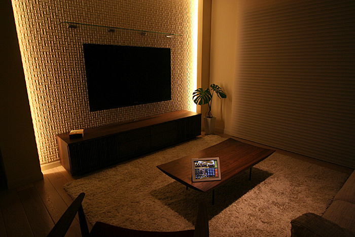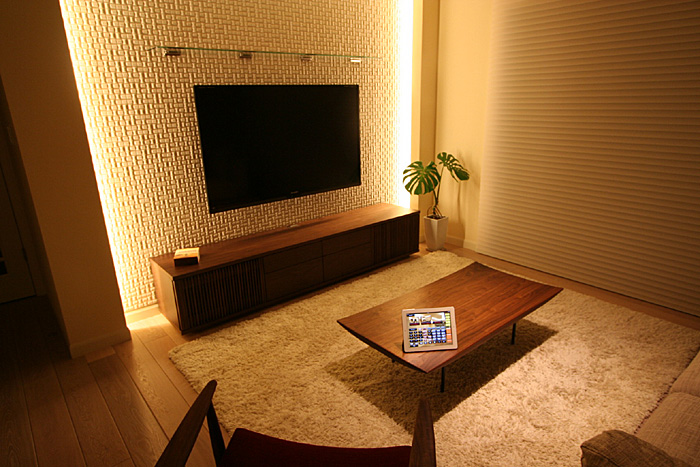 新築1Fリビングルームに壁掛TV、スクリーン、7.1chスピーカーシステム、キッチンスピーカー、iPadコントロールシステム等ホームシアターをインストール ホームシアターファイル65号掲載