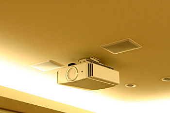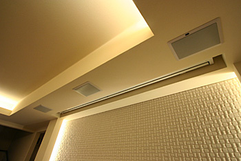 新築1Fリビングルームに壁掛TV、スクリーン、7.1chスピーカーシステム、キッチンスピーカー、iPadコントロールシステム等ホームシアターをインストール