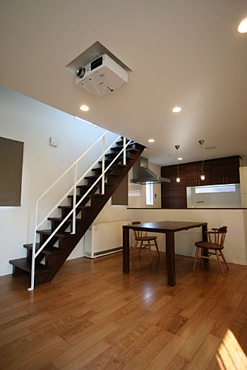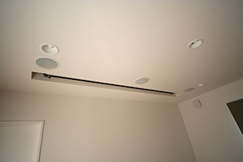 新築リビングにご主人待望だったホームシアターを設置。100インチスクリーン、プロジェクター、埋込みスピーカー等をインストール