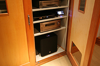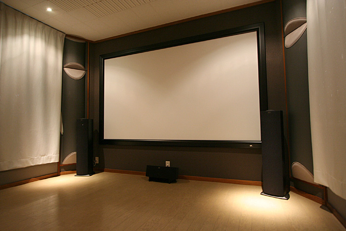 1Fのシアター専用ルームに120インチスクリーン、プロジェクター、7.1chスピーカーなどをインストール。 スクリーンは張り込みタイプを選択(120インチ)、フロントスピーカー、センタースピカーは置き型を選択。