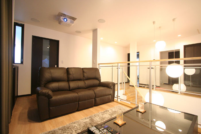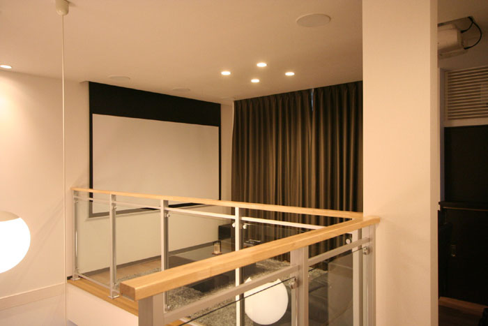 2Fのオープンスペースに100インチスクリーン、埋込みスピーカー等ホームシアターをインストール