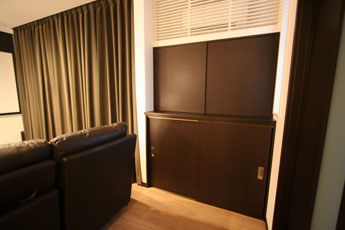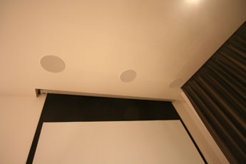 スクリーンは天井にボックスデザイン、フロントスピーカーは埋込み処理。リヤスピーカーは天井に埋込み、プロジェクターも天吊りです。