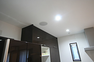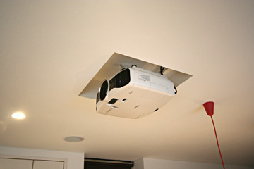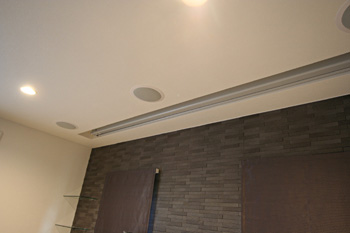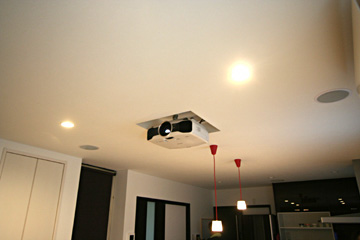 リアスピーカーも天井に埋込み、プロジェクターも天井を造作して吊り下げで設置。