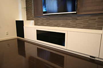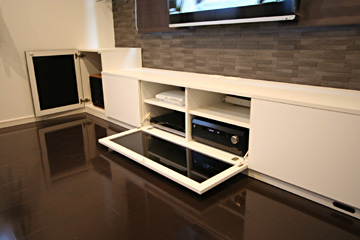 機材についてはラックをデザイン、アンプなどの各機器やサブウーハーが収まっています。