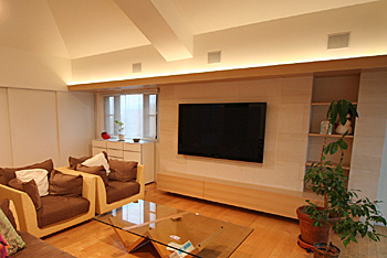 デザインマンション、リフォームを機会に60インチプラズマモニター、5.1chスピーカーシステム、キッチン用スピーカーなどをインストール。