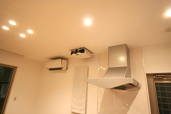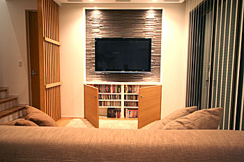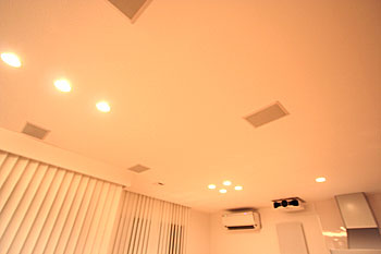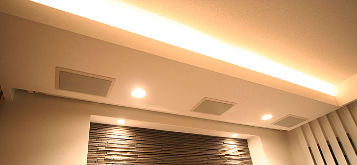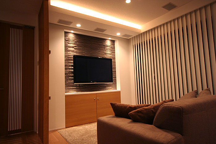 新築1Fリビング&ダイニングエリアに壁掛TV、スクリーン、7.1chスピーカーシステム、ルートロン、iPadコントロールシステム等ホームシアターをインストール ホームシアター57号掲載