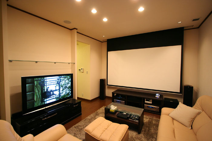 スクリーン120インチ、プロジェクター、7.1chスピーカーシステム、プラズマテレビ、AVアンプ、Blu-rayレコーダー、ミュージックサーバー、システムリモコンなどを取付け設置。