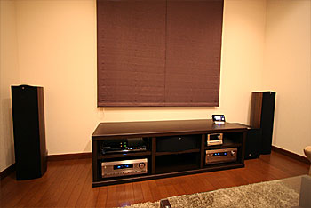 機材はラックに納めています、アンプが2台見えるのは1F用と2F用です、フロントとセンタースピーカーはKEFです。