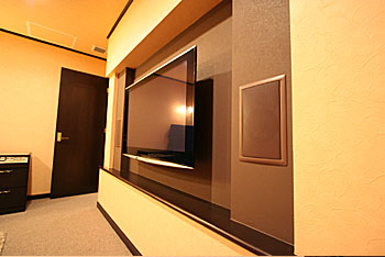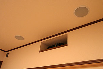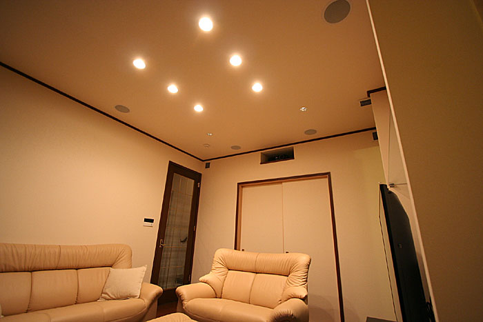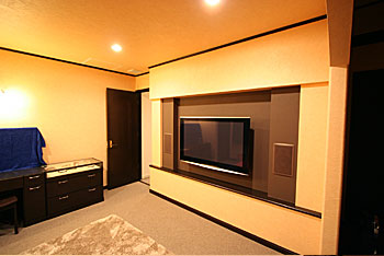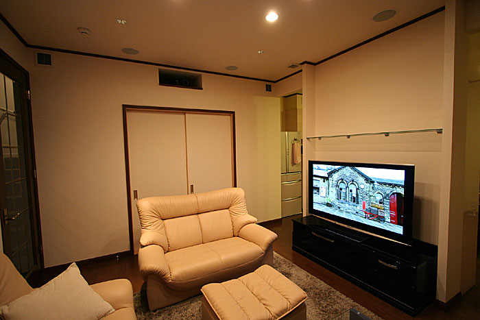 新築1Fリビングルームに、プロジェクター、スクリーン、7.1chスピーカーシステム、プラズマテレビ。2Fにはプラズマテレビ、埋込みスピーカーをインストール。